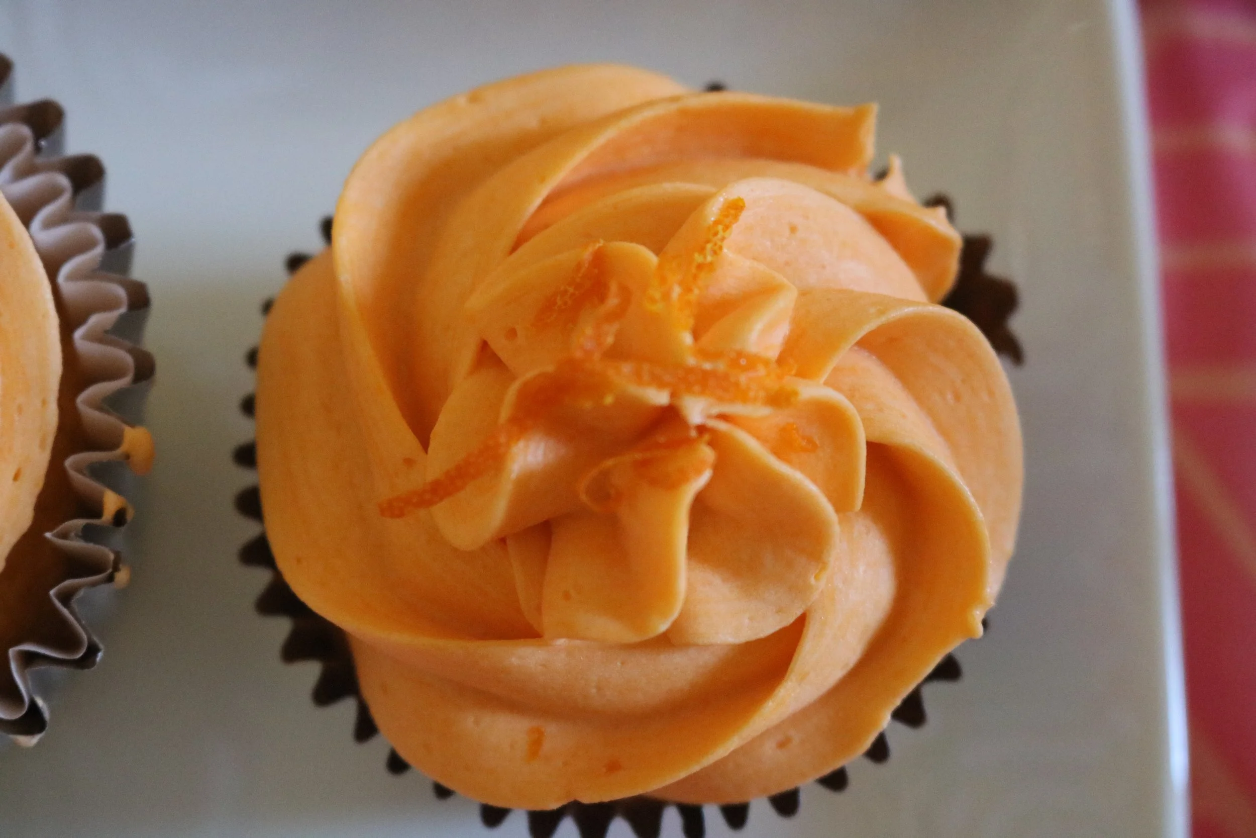 I’ve made chocolate cupcakes with orange frosting before, but never a vanilla-based cupcake infused with freshly-squeezed orange juice. The batch turned out well and I even substituted olive oil for sunflower or safflower oil to see if there was a taste difference. Yes, it was a bit stronger and it wasn’t as light and fluffy as it would’ve been if the usual vegetable oil had been used. I avoided using flavor oil but I added gel-based orange colorant for the cupcakes and frosting.